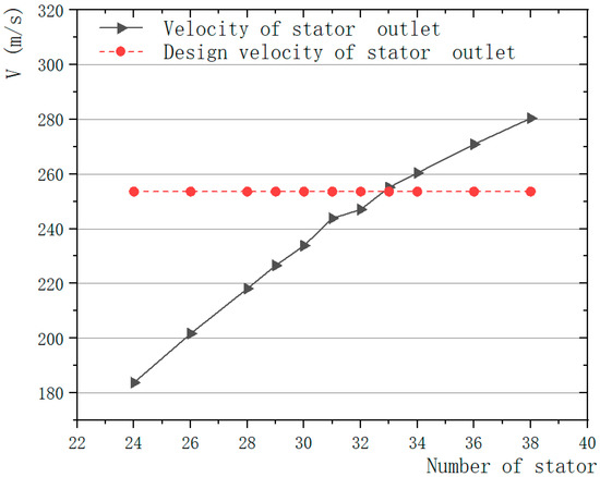 Comparison of design value and simulation value of stator outlet velocity under different at different number of stator blades.