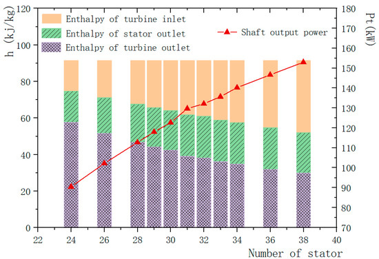 The influence of the number of stator blades on the enthalpy of the turbine inlet and outlet, the enthalpy of the stator outlet and the shaft power.