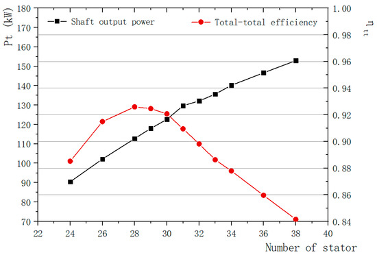 Although the shaft power keeps increasing as the number of stator blades increases, the total-total efficiency is different. As shown in Figure 13, the total-total efficiency shows a trend of rising first and then falling with the increase in the number of stator blades. And before the number of stator blades is 30, the efficiency drops slowly. After the number of stator blades is 30, the efficiency drops rapidly. When the number of stator blades is 28, the maximum value of total-total efficiency is obtained. The total-total efficiency is defined as Equation (8):