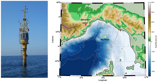 The experiment was realized in the Ligurian Sea, which is a semi-closed basin in the northwest Mediterranean Sea from 7 June 2016 to 10 October 2016. The area is surrounded by the Liguria region from the north and Corsica Island from the south. The W1M3A observing system [42,43] is permanently moored 80 Km from the Ligurian coast and on the route between Genoa and Cape Corse. For the experiment, the data collected by the compact weather station installed on the upper mast of the W1M3A observatory and several bio-chemical sensors deployed at the sea surface and beyond were used. The area is also covered by one weather radar located on mount Settepani (Figure 1). Technological, operational and technical information about the W1M3A observing system and the implementation of the experimental part of this work is described in details elsewhere [31].