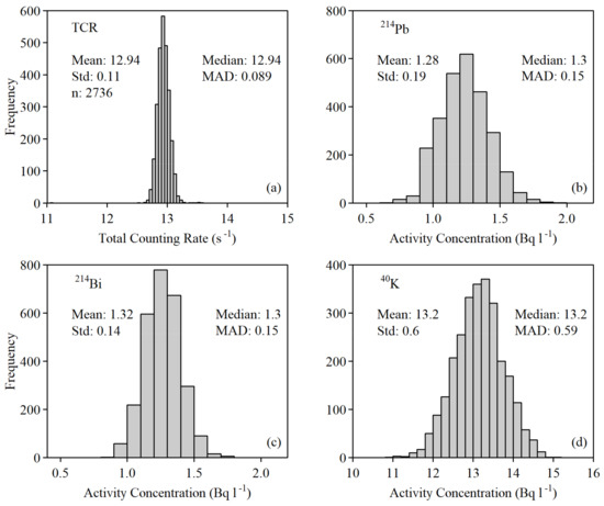 TCR represents the counting rate of the total number of gamma rays detected during one hour, and it was selected as the indicator for the rainfall event observation purpose due to its low statistical uncertainty. It includes detection events due to all natural and anthropogenic radionuclides present in the seawater that emit gamma rays in a spherical volume around the detector. Although TCR was directly obtained without spectral analysis, its variations are considered to mainly indicate changes of 214Pb, 214Bi and 40K activity concentrations responding to rainfall events since radon progenies and potassium 40K are the dominant radionuclides in the seawater. The TCR mean and median were found to be equal to 12.94 s−1 (with standard (Std) and median absolute deviation (MAD) deviation of 0.11 s−1 and 0.15 s−1, respectively), so the TCR distribution clearly approximates a normal distribution. Consequently, the TCR mean value standard deviation can be used as the criterion of statistically significant radioactivity variations due to rainfall events. The same analysis is presented in Figure 2b–d for the activity concentration of radon progenies (214Pb, 214Bi) and 40K, respectively. As expected, the concentrations of radon progenies are almost equal (214Pb: (1.28 ± 0.19) Bq l−1, 214Bi: (1.32 ± 0.14) Bq l−1), and its ratio 214Bi/214Pb is close to unity, revealing that during dry meteorological periods, radon progenies in seawater are in the state of radioactive equilibrium with their parent radionuclide of radon 222Rn. Additionally, the mean value for the 40K concentration was found to be equal to (13.2 ± 0.6) Bq l−1. These values have been considered as background level for radon progenies and 40K for the rest of the analysis and include radionuclides of seawater during dry meteorological periods and radionuclides that exist in the structural materials of the W1M3A observing system.