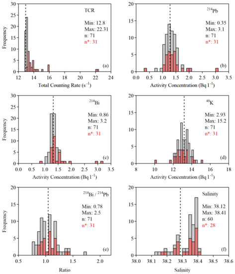 The distribution of TCR values obtained during rainfalls is depicted in the histogram of Figure 4a. Additionally, the distributions of 214Pb and 214Bi activity concentrations are presented in Figure 4b, c, respectively. Comparing with the mean values obtained during dry meteorological periods, most rainfall events resulted in a 214Bi increase and 40K decrease. For the case of 214Pb, almost half of the rainfall events resulted in its increment. During rainfall events when radon progenies and/or 40K activity concentration was reduced, there is no removal of the radionuclides from seawater. The decrease is attributed to their dilution, which occurs when rainwater containing lower concentrations of radionuclides (than that of background level of seawater) is mixed with the seawater, resulting in an apparent lower activity concentration. Moreover, the distribution of radon progeny ratio 214Bi/214Pb is presented in Figure 4e and salinity records in Figure 4f.
