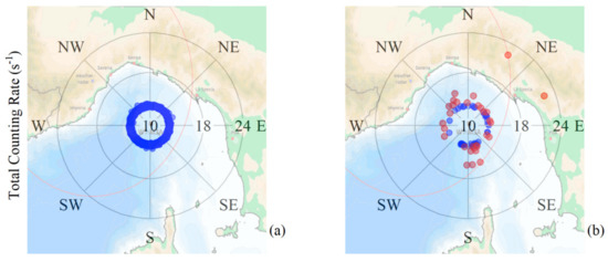 Analysis of TCR values with wind direction during dry meteorological conditions (a) and rainfalls (b). The events of statistically significant variation of TCR are presented with red dots.