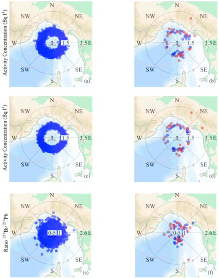 The analysis was repeated for the case of radon daughters and their ratio 214Bi/214Pb and is presented in the Figure 6. The activity concentration of both 214Pb and 214Bi in seawater follows the dependency of TCR with the wind direction, strengthening the outcome that a TCR increase during rainfalls is mostly induced by rainfall events rich in radon progenies. Unlike the cases of TCR and radon progenies, there is no obvious relation between the radon ratio and the wind direction. Analogous results have been reported from other geographical regions [60,61,62].
