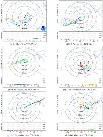 The model outputs evidence airflows confined in a very narrow layer (less than 500 m height above the ground level) and pathways over two days limited to about 300 km. During the rainfall events of June and August (Figure 7a–c), air masses were coming from the French coast, and the trajectories were mainly expanded over the sea. In those cases, the TCR value was moderately increased. During the rainfall events of September and October (Figure 7d–f), the origin of the pathways steadily turns to the mainland of Italy and Corsica Island, and the trajectories were expanded longer over terrestrial areas. In those cases, the TCR value was further increased and during the rainfall event of 8–9 October (Figure 7f), when the majority of the trajectories were over the mainland of Italy, TCR values reached the maximum value of 22.3 s−1. Although further investigation may reveal the favorable combination of cloud origin and heights for the TCR increment, its dependency from the aerial mass origin and pathways was clearly observed.