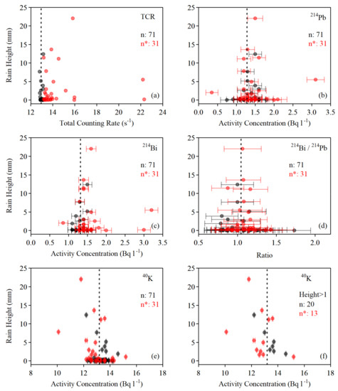 The rainfall height over TCR (a), 214Pb (b), 214Bi (c), radon progenies ratio (d), 40K (e) and 40K (f) for rain heights higher than 1 mm. The total number of events is n, and the events of statistically significant variation of TCR (n*) are presented with red dots. The mean value of each parameter during dry meteorological periods is presented with dotted line.