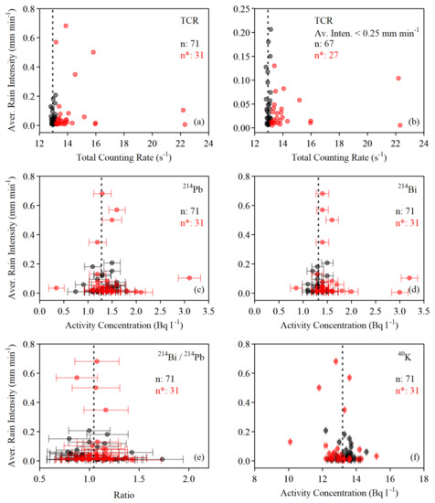 The average rainfall intensity over TCR (a), TCR for intensity lower than 0.25 mm min−1 (b), 214Pb (c), 214Bi (d), radon progenies ratio (e) and 40K (f). The total number of events is n. The events of statistically significant variation of TCR (n*) are presented with red dots. The mean value of each parameter during dry meteorological periods is presented with a dotted line.