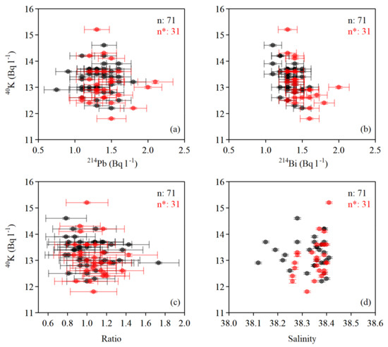 As outlined in the previous section, during rainfalls, rainwater potentially rich in radon progenies mixes with rich-in-40K seawater. In Figure 10, the relation of 40K with 214Pb (Figure 10a), 214Bi (Figure 10b), the ratio 214Bi/214Pb (Figure 10c) and seawater salinity (Figure 10d) at the depth of 6 m are presented. The most notable outcomes regard: