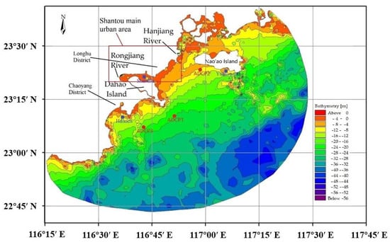 Compared with the traditional observation and acquisition, the use of numerical simulation is more efficient and more cost-effective [,]. By means of numerical simulation, we can better understand the distribution of tidal current in the Shantou sea area and the damage of storm surges. Numerical simulation technology has been applied well to the simulation of sea water movement and marine disasters. For example, Lai et al. [] used FVCOM to simulate the circulation in the Pearl River Estuary and reproduce the observation characteristics of ocean currents. Liu et al. [] studied the abnormal water increase in the Pearl River Estuary area caused by storm surges from Typhoon “Hato” through the numerical simulation of sea water movement. Xu et al. [] analyzed the hydrodynamic characteristics and silt backfill in the channel in the western port area of Shenzhen Port through numerical simulation using a mathematical model. Jia et al. [] established a two-dimensional hydrodynamic model of the Wanbao Lake based on MIKE21, and analyzed the dynamic characteristics of the lake and pollutant migration.