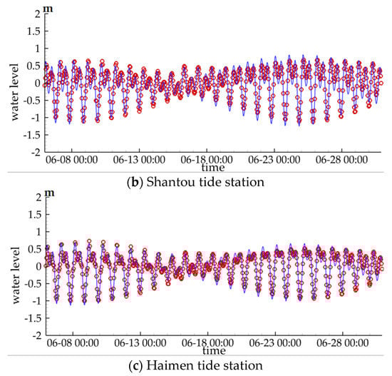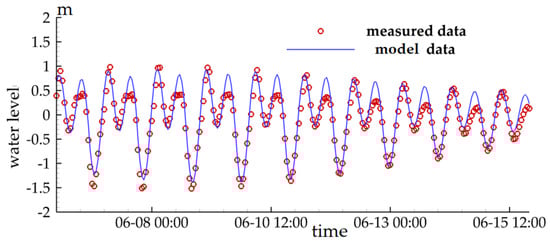 The model data were compared with the measured tide levels of the three tide stations. The temporal resolution of measured tide level data provided by the three tide stations was once an hour. 1 June to 5 June was the span time of the model. The remaining 25 days were used for verification. The results are shown in Figure 3.