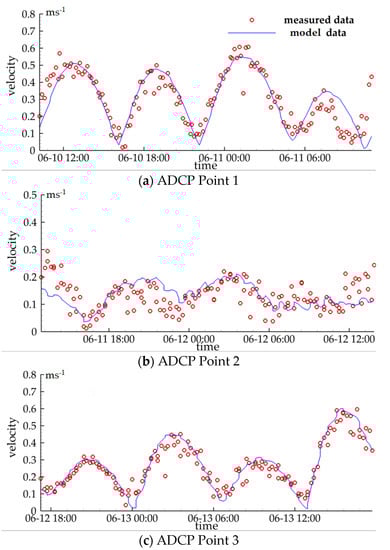 Figure 3 shows the comparison between the measured tide level and the model data. It can be found from the tide changes at the three tide stations that there are two unequal high tides and low tides in the study area within a day. Figure 3a shows the verification between the measured tide level and the model results of the Yunaowan tide station. The Yunaowan tide station is located in the southeast of Nan’ao Island, which is in the northwest of the study area. The average tide level in June here is about −0.03 m. The average tide level in June of the model is close to 0 m. According to the measured tide level in Yunaowan tide station, the maximum tidal range here is close to 2.5 m during the spring tide, while the tidal range is less than 1 m during the neap tide. It can be calculated that the average absolute error of the tide level in the model at Yunaowan tide station is 6.65 cm. Figure 3b is the verification of the measured tide level and the model results at Shantou tide station. Shantou tide station is located near Shantou Port and in the mouth of Rongjiang River. According to the measured water level of Shantou tide station, the average tide level here is −0.02 m, while the average tide level of the model results here is 0.03 m. According to the measured tide level of Shantou tide station, the tidal range of Shantou tide station is close to 1.8 m during the spring tide. The tidal range is about 0.8 m during the neap tide. The mean absolute error of the tide level in the model at Shantou station is 7.11 cm. Figure 3c shows the verification between the measured tide level and the model results of Haimen tide station. Haimen tide station is located near the southwest of the study area. According to the measured tide level, the average tide level here is about −0.02 m, while the average tide level of the model results is 0 m. According to the measured water level data of Haimen tide station, the tidal range of Haimen tide station is about 1.7 m during the neap tide. The tidal range is about 0.6 m during the neap tide. According to the calculation, the mean absolute error of tide level in the model at Haimen tide station is 4.05 cm. The comparison between the model and the measured tide level of the three tide stations shows that the model is in good agreement with the measured data. The mean absolute errors of the three locations are 6.65 cm, 7.11 cm, and 4.05 cm, respectively.