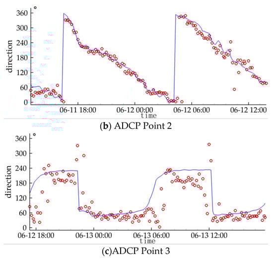 The observation time of sea current at each place is 25 h. This covers a complete lunar day. The velocity verification is shown in Figure 4 and the direction verification is shown in Figure 5.
