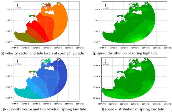 Figure 6a,b shows the distribution of tide level and current velocity in the study area at astronomical spring tide rising time. At this time, the sea water flows from southwest to northeast, and the overall flow direction is roughly parallel to the coastline. Near the mouth of the Rongjiang River, the bulging terrain of Dahao Island plays a role in blocking the current. Some seawater enters Haojiang River, while others bypass the island. At the east side of Dahao Island, the velocity of the sea water can exceed 1 ms−1 at this time. There are also current diversions on both sides of Nan’ao Island, which are distributed from the east and west sides to bypass the island. This is also a place where the sea flow velocity is high, and the flow velocity can reach 1 ms−1. The tide level in the whole study area showed a trend of high in the southwest and low in the northeast, but the water level is not much different. The water level in the southwest was about 0.4 m higher than that in the northeast. There is a fast flowing area in the south of the study area, while the sea area east of Nan’ao Island is relatively calm. Figure 6c,d shows the distribution of tide level and current velocity in the study area during astronomical spring tide falling time. The water now flows from northeast to southwest, also roughly parallel to the coastline. Compared with the flood tide, the flow velocity near Nan’ao Island is lower at ebb tide, but the flow velocity near Dahao Island is still faster, exceeding 1 ms−1. The sea water flows out of the estuary at ebb tide. At this time, the water level was high in the northeast and low in the southwest. The difference of water level was still small, about 0.4 m. The velocity distribution of sea water in the sea area is roughly the same as that in the spring tide. Figure 6e–h show the distribution of tide level and sea velocity in the study area at astronomical neap flood tide and ebb tides, respectively. At this time, the distribution of tidal current in the study area is basically the same as that at astronomical spring tides. However, the flow velocity is low, generally lower than 0.5 ms−1. The difference in water level in the study area is small. The water level of the whole sea is relatively uniform. Figure 6i,j shows the distribution of tide level and velocity during high tide in the study area. At this time, the current velocity of the whole sea area is slow, and the current velocity of the nearshore part of the whole study area is generally lower than 0.1 ms−1. The tide level of the whole Shantou sea area is high. The water level gradient is large, showing a trend of high in the northeast and low in the southwest, with a difference of more than 1 m. Figure 6k,l shows the distribution of tide level and velocity at low tide in the study area. Consistent with the high tide, the current velocity is slow. On the contrary, the tide level is low in the northeast and high in the southwest, but the water level gradient is slightly smaller than that at the high tide.