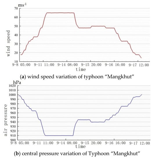 Typhoon “Mangkhut” is a super typhoon that was generated at 20:00 on 7 September 2018 over the Northwest Pacific Ocean. On 10 September, the typhoon moved to the southwest. At 8:00 on 11 September, it became a super typhoon. On 15 September, the typhoon passed through the northern Philippines and moved to Guangdong Province of China. At 17:00 on 16 September, Typhoon “Mangkhut” landed in Haiyan town with a maximum wind force of 14 and a central minimum pressure of 955 hPa. In the afternoon of 17 September, the typhoon weakened to a tropical depression, and then continued to move to the northwest. The typhoon basically dissipated until 20:00 []. Figure 9 shows the wind speed and central pressure of Typhoon “Mangkhut”.