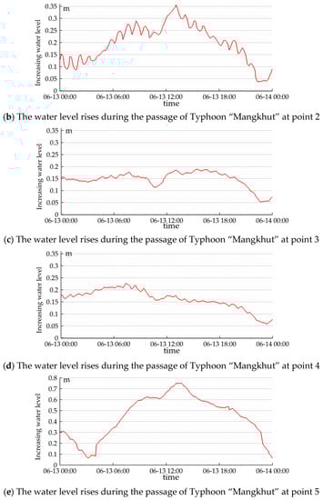 Five typhoon monitoring points were selected to compare the different responses of the water surface height relative to the general state when the typhoon transited, and the different response of speeds when there was no wind, normal wind, and when the typhoon transited. See Table 5 and Figure 11 for its distribution and information.