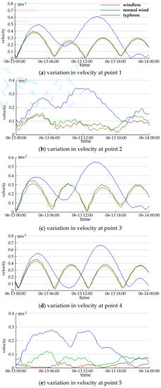 Figure 12 shows the water level increase comparison of five points. The influence of wind fields is more obvious at the shallow water depth (see Figure 12b,e) than at the deep offshore water depth (see Figure 12a,c,d). When the typhoon passed through, the tide elevation generally increased significantly. Within 24 h, the average water increases at five points were 0.17 m, 0.20 m, 0.15 m, 0.16 m, and 0.45 m, respectively. The maximum water increases were 0.24 m, 0.35 m, 0.19 m, 0.23 m, and 0.75 m, respectively. In addition to the tide level, the typhoon also affects the velocity of the sea. In Figure 13, the red line means there is no wind in the area. The green line is the normal wind field and the blue line is the wind field of typhoon “Mangkhut”. Figure 13 shows the variation in velocity under different wind conditions. In the region of high current velocity, the sea current velocity is mainly controlled by tide, and the influence of the normal wind field is limited (see Figure 13a,c,d). In the area of low current velocity, the sea current velocity is less affected by the tide. The normal wind can also cause a larger change in the velocity (see Figure 13 b,e). When a typhoon exists, the sea current velocity is mainly determined by the typhoon at any control point (see Figure 13a–e).