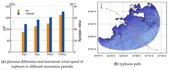 In this study, four typhoons with different central pressures were constructed, and each typhoon represented a different recurrence period. The four typhoons have the same path and all landed in Shantou. The typhoon path is shown in Figure 14. The information of each typhoon is shown in Table 6: