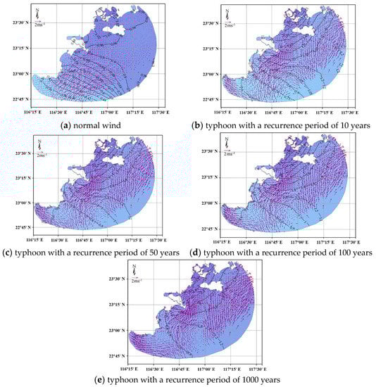 Figure 15a shows the comparison when there is no typhoon. This moment is the high tide of the astronomical spring tide. The sea water flows from northeast to southwest. Figure 15b–e, respectively, show the situation of typhoons with recurrence periods of 10 years, 50 years, 100 years, and 1000 years. The central air pressure of the typhoon is set at 940 hPa, 920 hPa, 910 hPa, and 880 hPa, respectively. When a typhoon appears, the sea current in the study area is controlled by the typhoon. In the model, the typhoon center path roughly passes through the center of the study area, moves from southeast to northwest, and lands in Shantou City near the Rongjiang River estuary. The northeast side of the Rongjiang River estuary is on the right side of the typhoon path, while the southwest side of the Rongjiang River estuary is on the left side of the typhoon path. Shantou City is located near the Tropic of Cancer, belonging to the northern hemisphere, affected by the geotropic deflection force. The typhoon wind field has counterclockwise rotation. In the study area, the water flow on the northeast side basically flows from south to north, while on the southwest side, the velocity vector is roughly the same as that of the typhoon, indicating that the direction of the water flow was controlled by the typhoon at this time. The flow direction of sea water is basically the same under typhoons of different intensities. In terms of velocity, the sea current is affected by both the wind field and the tide. On the left side of the typhoon path, the wind is in the same direction as the current caused by the tide. The superposition of the two makes the flow rate fast. On the right side of the typhoon path, the direction of wind is opposite to the direction of the tide. The velocity of the two is offset, so the velocity is not as fast as the sea water on the right side of the typhoon path. By comparing the distribution of sea level in the absence of typhoons, it can be found that the presence of typhoons will obviously cause a rise in sea level and a decrease in water level gradient. The more intense the typhoons are, the more the water level is increased.