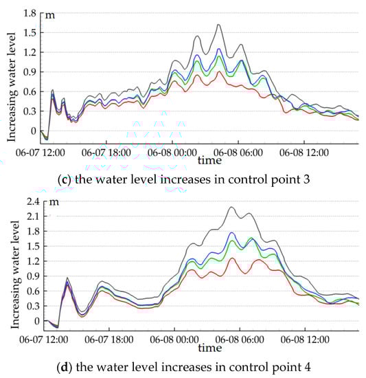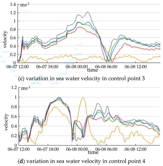Figure 16 shows the increment in water level in the typhoon with different recurrence periods compared with the normal wind field. Figure 16a–d, respectively, correspond to the four control points selected. Figure 17 shows the changes in sea water velocity in the passage of typhoons in different recurrence periods and compares them with those in the absence of typhoons. Figure 17a–d, respectively, correspond to the four control points selected.