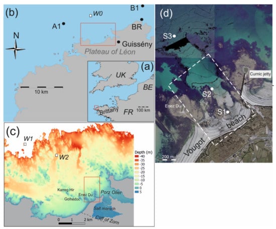 Location of Vougot beach on the north coast of Finistere in Brittany, France (a) in the municipality of Guisseny (b), showing the Brignogan wind measuring station from Météo France (BR: 48.68° N 4.33° W), and the offshore corner points (AG1 and BG1) of the coarse-grid model domain (G1 in Figure 4). Topo-bathymertry of the northern coast of Finistère (c), including the study site (digital elevation model Litto3D–Finistère 2014, produced by IGN and SHOM, https://diffusion.shom.fr/pro/risques/litto3dr-finistere-2014.html, accessed on 22 January 2015) W1 (48.67° N 4.53° W, 44 m depth) and W2 (48.65° N 4.39° W, 23 m depth) are the locations of waves. Satellite image of Vougot Beach (d) indicating the study area (dashed white rectangle) and the location of the pressure sensors (S1, S2 and S3). Red rectangles show the spatial extent of each subsequent inset.