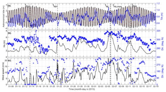 The predicted astronomical tides at AG1 and BG1 (see Figure 1b) were obtained from the tidal database of European Shelf 2008 (ES2008) using the online tool Delft Dashboard, (https://publicwiki.deltares.nl/display/DDB/Delft+Dashboard, accessed on 15 December 2020). During the analysis period, the average phase difference between locations AG1 and BG1 was about 10 min, and the spring and neap tidal ranges were approximately 7.5 m and 2.4, respectively (Figure 2a). The maximum tidal anomaly (TA: total water level—astronomical tide) reached up to 1.1 m during the storm event that occurred around 6 February 2013, caused primarily by storm surge at this water depth.