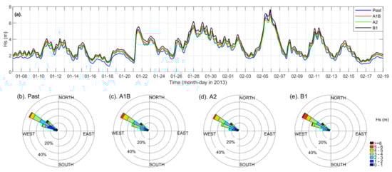 Comparison of (a) wave height and wave roses during the (b) historical period from 7 January–18 February 2013, and (c) A1B, (d) A2, and (e) B1 future wave projections at W1.