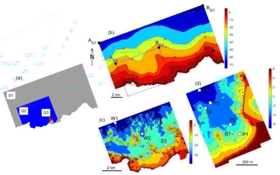 The model bathymetries were created using the two sources of data. The G1 bathymetry (200 m × 200 m, the same scale as the model grid) was based on the GEBCO 08 (https://publicwiki.deltares.nl/display/DDB/Delft+Dashboard, accessed on 15 December 2020) dataset and did not represent the strong bathymetric variations in the nearshore region (Figure 4b). The G2 and G3 bathymetries were constructed by interpolating the high-resolution (1 m × 1 m) digital elevation model Litto3D® (https://diffusion.shom.fr/pro/risques/litto3dr-finistere-2014.html, accessed on 22 January 2015) (Figure 4c,d) onto the 2 models’ grids to capture the finer details of the bathymetric variations. However, the offshore area of G2 was not entirely covered by this dataset, and the data gaps were filled by triangular interpolation using neighboring available depth values (Figure 4c). The highest resolution grid, G3, represented the finer details of the bathymetry well, with a resolution of less than 10 m in the cross-shore and alongshore directions representing the jetty of Curnic and the reef at the eastern and western ends of the domain, respectively (see Figure 1d and Figure 4d).