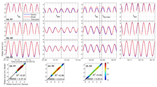 The simulated water levels agreed well with the measurements with R2 > 0.97 and RMSE < 0.37 m at S1, S2, and S3 (Figure 5d–f). The model was able to reproduce well the amplitude and phase of the measured water levels, with better agreement in deeper water (S3) than in shallow water (S1).