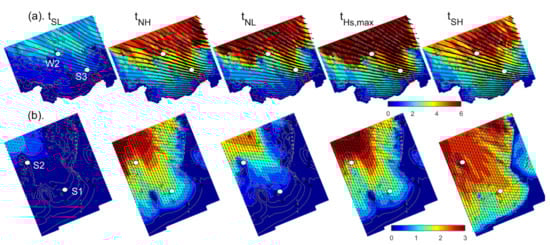 Wave height (color) and direction (vectors) in the G2 (a) and G3 (b) model domains at the selected five dates, tSL: spring-low water, tNH: neap-high, tNL: neap-low, tHs,max: peak storm wave height, tSH: spring-high. S1, S2, and S3 indicate the locations of the pressure sensors, and W2 indicates the location of the wave time series obtained from WW3. The red rectangles in (a) show the location of the G3 domain.