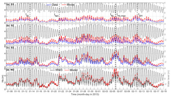 Comparison of the measured (blue) and the simulated (red) wave heights at the pressure sensor locations: (a) S1, (b) S2, and (c) S3 (see Figure 6). (d) Comparison of wave heights at W2 from WW3 (black line) and the present Delft3D model (red line). The gray line indicates the simulated water levels and the vertical dashed lines indicate the selected dates: tSL: spring-low, tNH: neap-high, tNL: neap-low, tHs,max: peak storm wave height, and tSH: spring-high water.