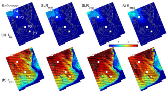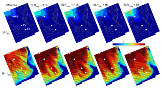 Simulated wave height distributions in the G3 domain for the reference, SLRmin, SLRavg, and SLRmax scenarios for tSL: spring-low water (a) and tSH: spring-high water (b), indicating the analysis locations (white squares) P1 (0 m depth), P2 (2 m), P3 (4 m), and P4 (6.5 m).