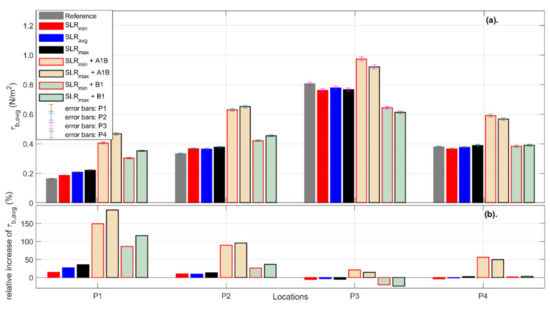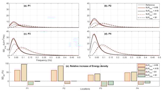 The average wave energy density spectrum (SDavg) was calculated for the reference analysis period from 7 January–18 February 2013 and for the future SLR scenarios at four selected locations along a cross-shore profile (P1–P4, see Figure 8). As the water depth increased from P1–P4, SDavg increased, the spectral shape tended to be more skewed, and the spectral peak shifted toward lower frequencies from 0.04 Hz at P1 to 0.03 Hz at P4 for all scenarios (Figure 9). At the four selected points, the SLR simulations showed greater SDavg relative to the reference simulation. In addition, SDavg also increased with increasing SLR, which is coherent with increases in the spectral energy for increasing water depths. Overall, the differences in SLR scenarios appear to have marginal effects on the average spectral shape.