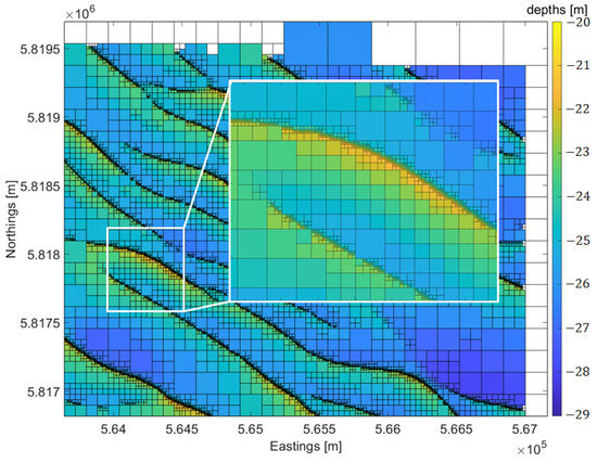 For the preparation of the time series, there are options for the original data to be gridded on a uniform grid (for e.g., 5 m × 5 m) or using a new quadtree approach [24] for creating a multi-resolution DEM, taking into account the heterogeneity of the data in space and time and the variability of the depths. This allows for optimal use of the time series of data available without loss of details in the final, resulting DEM [25]. Previous research [25] suggested the optimal criteria and standard deviation threshold (measure of variability within a grid cell), values for this application. These suggestions are still flexible depending on the end-users’ requirements. The quadtree approach also uses a time ordered approach to store the depths for each epoch or survey moment [25]. Figure 2 shows an example of a single epoch decomposition with m.