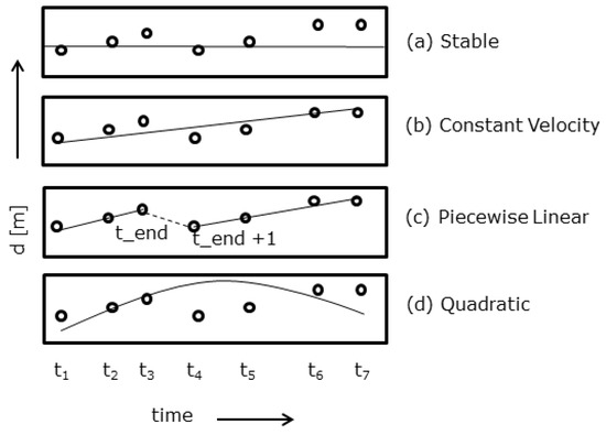 - Due to irregularities in the data it can occur that the piecewise linear model is accepted, although in reality the constant velocity model should be selected. Additionally, the length of the time series and the larger number of unknown parameters in the piecewise linear model can result in over-fitting.