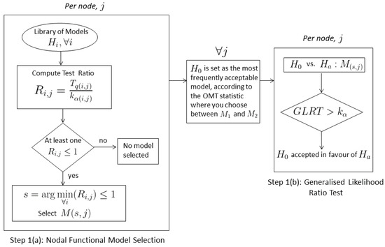 Since the library of models vary in complexity and hence has different dimensions, these models will follow different distributions. This implies that when comparing the goodness of fit of these models, Equation (13) cannot be used. Instead, to account for the varying complexity of the models (more unknown parameters could result in over-fitting), the test statistic in Equation (13) can be normalised by dividing by the critical value, denoted by the statistical significance, . The test ratio value for each node is defined in Equation (15).