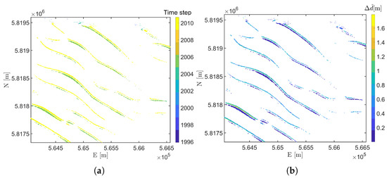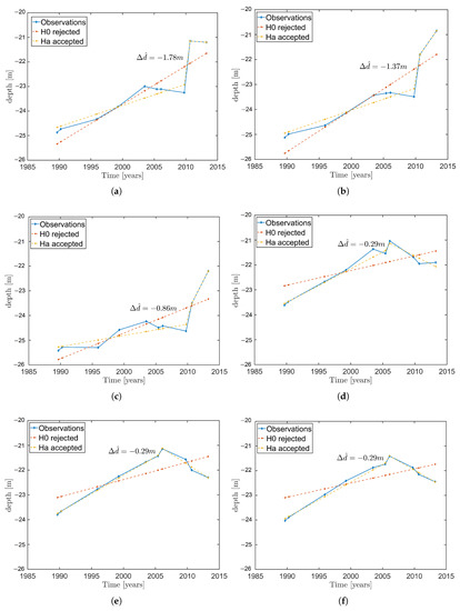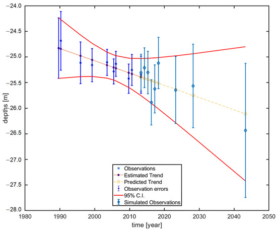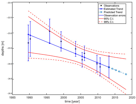 The input data are therefore gridded so that each grid node represents the mean depth, its variance value and the time of survey defined by the year and month. The variance of each gridded depth value is a combination of the measurement uncertainty (provided by the standards [1]) and the spatial uncertainty (which takes into account the number of observations per grid cell). In [7] the size of the grid cells was limited to 50 m × 50 m and in [8] 25 m × 25 m. For SBES data that requires interpolation, the stochastic interpolation method of Universal Kriging [26] is applied which provides the gridded depth values d and the uncertainty, . Previous studies of [8,27] applied a vertical nodal analysis using linear regression for each node, excluding an uncertainty analysis of the estimated vertical trend as opposed to this contribution. The time series analysis requires the following input: