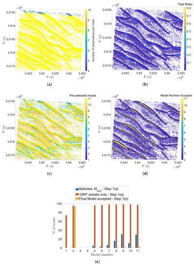 To describe the overall model inconsistency separately, for each of the functional models, the general expression of the Overall Model Test (OMT) statistic is first applied and defined as in Equation (13), where i represents the model number and j the node. The OMT statistic gives the quality of the model approximation by observing the relationship between the residuals, , which is the difference between the observations and the adjusted observations using the estimated parameters of the model and the uncertainty of gridded depth values defined by the diagonal of the variance-covariance matrix .