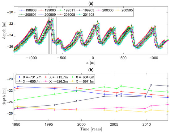 For this paper, a 0D spatial analysis was chosen to determine the most likely functional model to avoid any spatial assumptions on the seafloor dynamics when defining the library of functional models. An advantage of the choice of 0D analysis is that the patterns related to temporal trends in the changes in depths can be revealed for different nodes (e.g., the crests and the troughs) whereby a distinction can be drawn since they may exhibit different behaviours. In deformation studies such as in [10,13] a 0D approach was also taken and in the case of ground deformation in [14] using Interferometric Synthetic Aperture Radar (InSAR) point scatterers, adding flexibility to the applicability of the 0D approach.