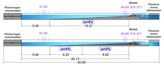 Two-dimensional physical tests were performed by [] in the wave flume (30 × 1.2 × 1.2 m) of the Laboratory of Ports and Coasts at the Universitat Politècnica de València (LPC-UPV). Two configurations of the wave flume were considered: (1) a continuous ramp with a bottom slope m = 4%, and (2) a 6.25 m-long m = 4% ramp followed by a 9.0 m-long m = 2% ramp. These bottom slope configurations are depicted in Figure 1.