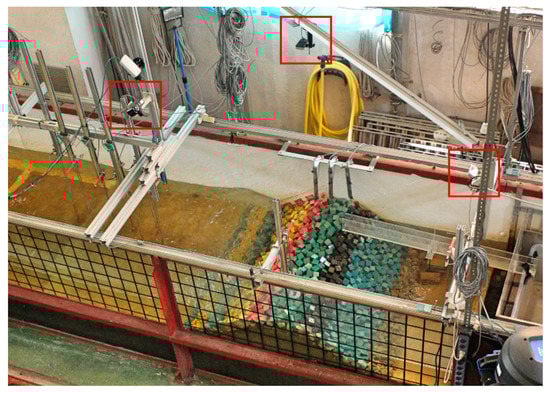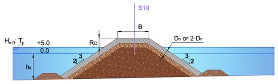 Eleven capacitive wave gauges were installed to measure water surface elevation all along the wave flume. Five wave gauges (S1 to S5) were placed in the wave generation zone following []; S1 to S5 were used to separate incident and reflected waves in the wave generation zone. Four wave gauges (S6 to S9) were installed close to the model at distances from the model toe 5hs, 4hs, 3hs and 2hs, respectively. It should be noted that depth-induced wave breaking takes place in the model zone, so the existing methods to separate incident and reflected waves are not reliable. Two extra wave gauges were placed in the middle of the breakwater crest (S10) and behind the breakwater model (S11); S10 was used to analyze the overtopping layer thickness [] whereas S11 was used to detect possible phenomena of water piling-up. Overtopping discharges were recorded using a weighting system located behind the model [].