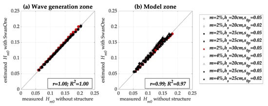 The measured spectral wave height without a structure (total waves) compared to the incident spectral wave height estimated by the SwanOne model: (a) in the wave generation zone, and (b) in the model zone.