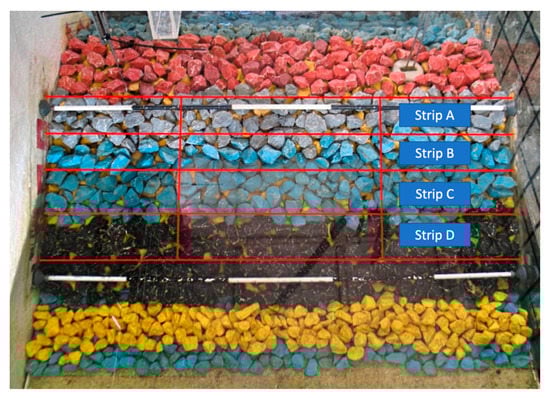 In Section 2.1, quantitative and qualitative methods to analyze the hydraulic stability of mound breakwaters are summarized. As previously mentioned, the Virtual Net method by [] is applied in this study in order to account for the HeP failure mode in the quantitative analysis of armor damage. Pictures were taken perpendicular to the slope using the cameras as shown in Figure 3 before starting the tests and after each test to analyze the evolution of armor damage over time. The front slope, crest and rear slope were divided into strips. The front slope and rear slope were divided in four strips of 3Dn or 4Dn while one strip of 6Dn was considered on the crest. Only the central part of the model was included in the analysis to avoid interference with the boundaries of the flume or the instrumentation on the crest (see Figure 3). Si was calculated for each strip after each test, and it was integrated to obtain Se. An example of the application of the Virtual Net method on the rock-armored model is presented in Figure 5.