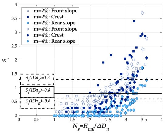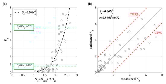 The empirical coefficients K1 = 0.05 and K2 = 3 for Equation (14) were calibrated within the ranges 1.0 ≤ Hm0/ΔDn ≤ 3.6 and 1.2 ≤ Rc/ΔDn ≤ 3.2. Based on this calibration, Ns (IDa) = 2.5. IDe level was reached in just one test with Se = 3.7, which corresponds to Ns (IDe) = 4.3 when applying Equation (14), but it is beyond of the experimental ranges of the fitted formula. The 90% confidence interval of Equation (14) shown in Figure 8b is calculated, assuming a Gaussian error distribution, as