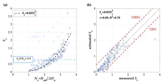 Performance of Equation (14) with K1 = 0.005 and K2 = 5 to estimate armor damage of the crest of the cube-armored model: (a) Fitting to the measured data and IDa level, and (b) measured against estimated Se.