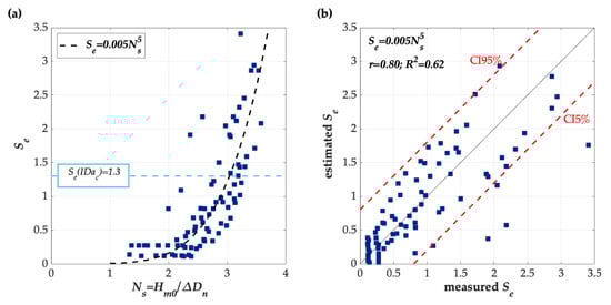 Performance of Equation (14) with K1 = 0.06 and K2 = 5 to estimate armor damage of the front slope of the rock-armored model: (a) Fitting to the measured data, IDa and IDe levels, and (b) measured against estimated Se.