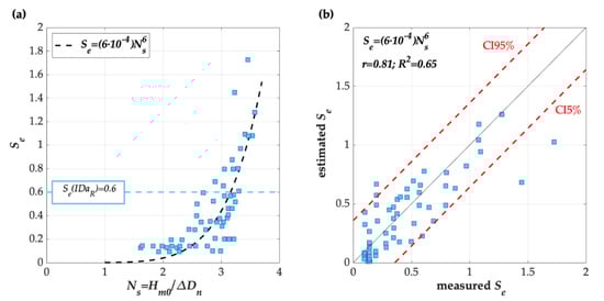 The failure of the front slope of the rock-armored model was achieved before noticeable overtopping discharges took place (Q = q/(gHm03)0.5 < 4 × 10−4, where q is the mean wave overtopping discharge and g is the gravity acceleration), so the armor damage appeared mainly on the front slope. Thus, only results for the front slope are used to calibrate Equation (14) in this section; the best fit was obtained for K1 = 0.06 and K2 = 5 with R2 = 0.72. Figure 7a shows the fit of Equation (14) with K1 = 0.06 and K2 = 5 to the experimental data, as well as the IDa and IDe levels. Figure 7b compares the measured and estimated Se using Equation (14) with K1 = 0.06 and K2 = 5; the 90% confidence interval (CI) is also given.