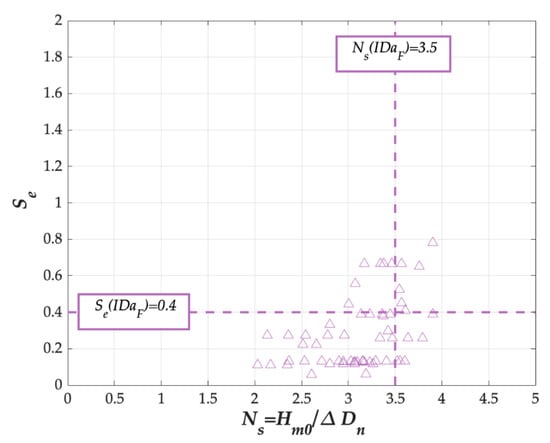 The Cubipod®-1L armor had a higher hydraulic stability than did the rock-2L and cube-2L armors. Therefore, high overtopping discharges were reached during the tests (Q < 9 × 10−3), similar to the tests conducted with cube-2L. However, since no damage appeared on the rear slope, only the armor damage to the front slope and crest is described in this section. It should be noted that very low levels of damage were reached during these tests (Se < 1), so it was not possible to calibrate Equation (14) properly. Figure 11 provides the data of the armor damage to the front slope of the Cubipod®-1L model, as well as the IDa level. Se (IDa) = 0.4 corresponds approximately to Ns (IDa) = 3.5, obtained as the average value of the observed Ns (IDa). The damage level IDe was not observed in any test. These results are valid within the ranges 2.0 ≤ Hm0/ΔDn ≤ 3.9 and 1.5 ≤ Rc/ΔDn ≤ 2.6.