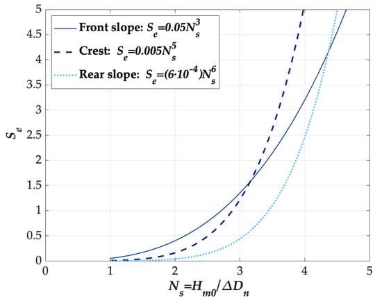 where K1 and K2 are empirical coefficients to be calibrated, and Ns = Hm0/ΔDn is the stability number calculated with Hm0 given by the SwanOne model at a distance of 3hs from the toe of the model, following the recommendations by [,].
