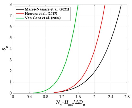 Figure 15 compares Equation (14) with K1 = 0.06 and K2 = 5 and Equations (5) and (6) developed by [,], respectively. It should be noted that for rock armors, HeP failure mode is not dominant, so S ≈ Se []. Note that different experimental set-ups were used in the compared studies, as shown in Section 2.