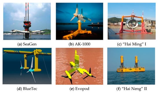 Fixed and floating tidal current turbine worldwide. (a) SeaGen; (b) AK-1000; (c) “Hai Ming” I; (d) BlueTec; (e) Evopod; (f) “Hai Neng” II.